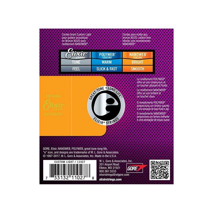 Elixir Strings Acoustic 80/20 Bronze with NANOWEB Coating deliver distinctive phosphor bronze warmth and sparkle together with extended tone life.