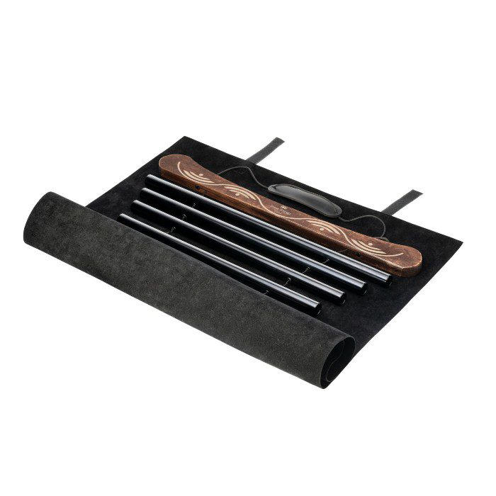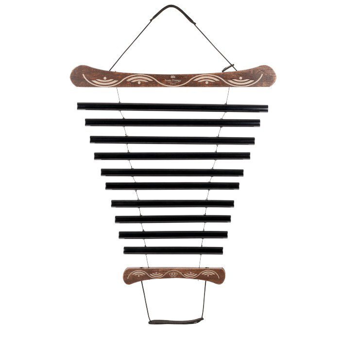 The sound tubes hang on sturdy nylon cords, centered in two ash wood holders. The tubes are made of corrosion-resistant aluminum and can be played separately or together.
