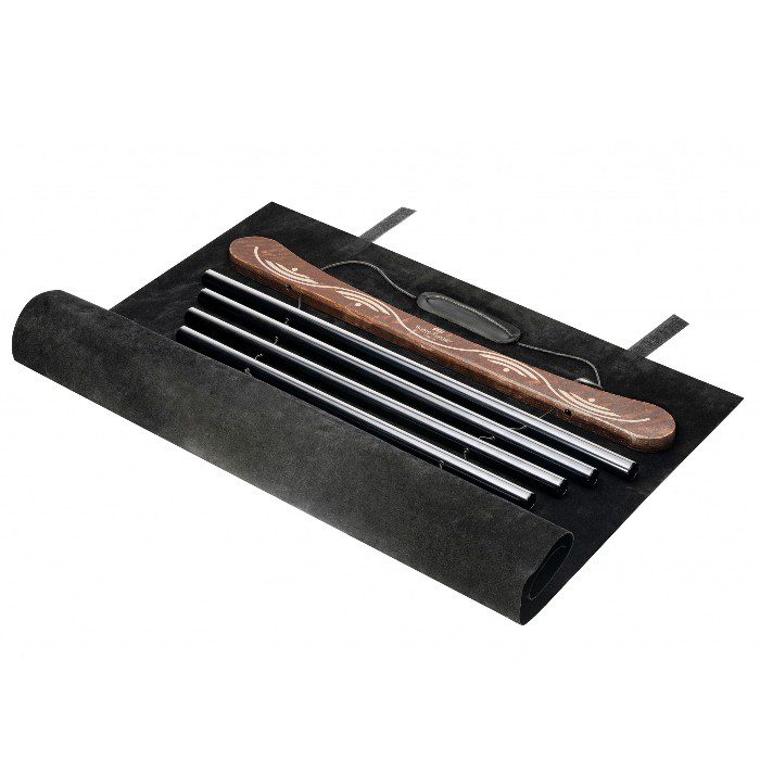 The sound tubes hang on sturdy nylon cords, centered in two ash wood holders. The tubes are made of corrosion-resistant aluminum and can be played separately or together.